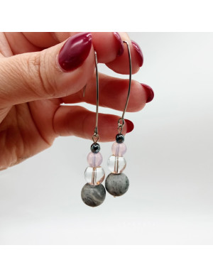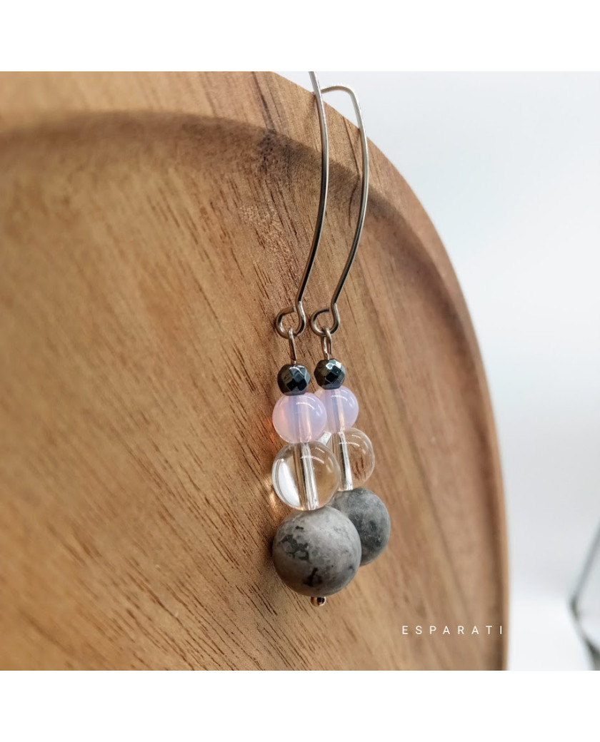 Kolczyki zakończone są elementami ze stali szlachetnej 316 L w kolorze srebrnym. Jest to materiał 100 % antyalergiczny. Nie zawiera niklu, lidu, ołowiu. Biżuteria może być noszona przez osoby o wyjątkowo wrażliwej skórze.