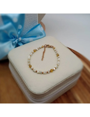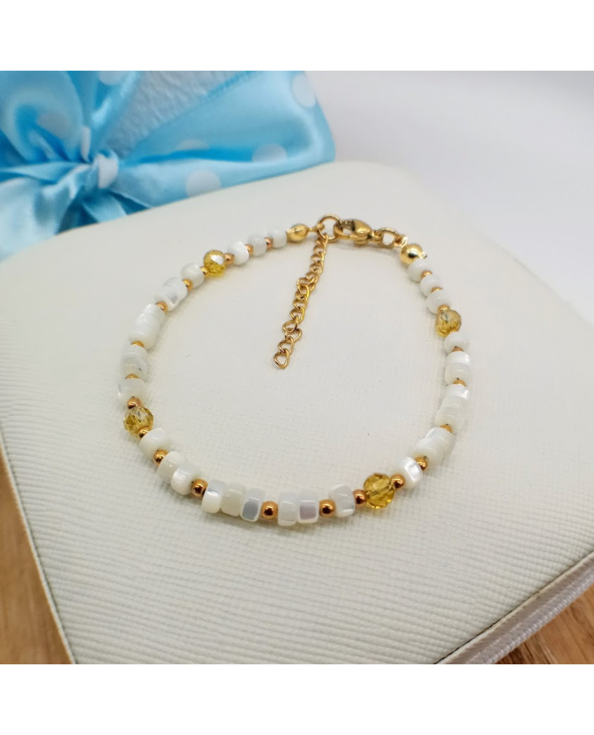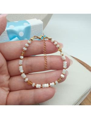 Bransoletka Golden Shell Glow powstała z naturalnej muszli, kryształków i złotych hematytów.