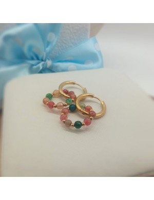 Kolczyki o długości 4 cm zostały wykonane na bazie kół ze stali szlachetnej w złotym kolorze i ozdobione różnokolorowymi agatami. To połączenie klasycznej formy i naturalnego piękna kamieni, które sprawia, że kolczyki są jednocześnie eleganckie i pełne radości.